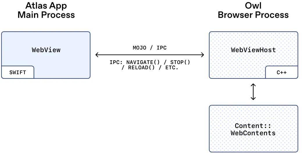 从高层来看,Atlas 浏览器是 OWL 客户端,而 Chromium 浏览器进程是 OWL 主机(Host)。两者通过 Mojo(Chromium 的进程间通信系统)进行通信。OpenAI 编写了 Swift(甚至 TypeScript)的 Mojo 绑定,使 Swift 应用能直接调用主机端接口。