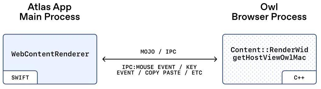 OWL 是 OpenAI 整合 Chromium 的方式,其核心理念是:让 Chromium 的浏览器进程独立运行在 Atlas 主应用进程之外。