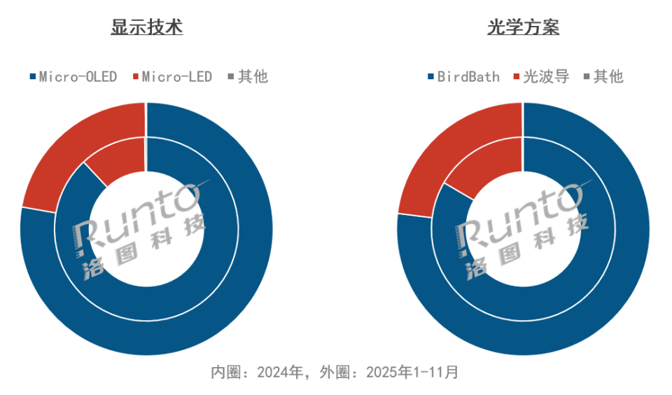 2025年 中国AR眼镜线上市场显示技术和光学方案销量占比及变化