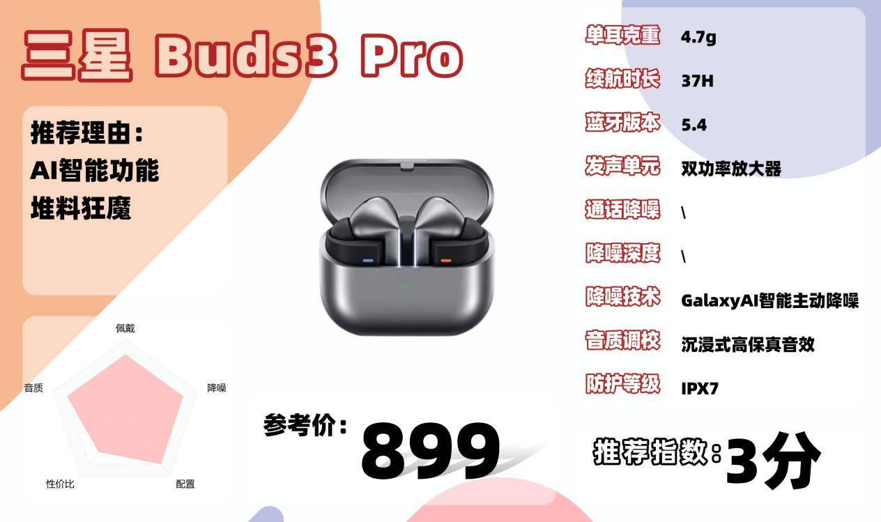 Buds3 Pro 采用了双扬声器设计,加入了平面高音单元,支持 24bit/96kHz 高清音频。听感上偏“V型”调音,低频饱满、高频透亮,中频人声略靠后,整体比较适合听流行、电子类音乐。它支持三星自家的 SSC 编码,并能根据听力自动调节 EQ。不过想要发挥全部实力,最好还是配合三星手机使用,其他品牌手机连接后部分功能会受限。