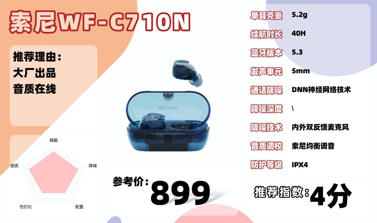 WF-C710N 只支持 SBC 和 AAC 编码,没有 aptX 或 LDAC,但索尼的调音依然在线。整体听感厚实,低频量感充足,下潜到位但不闷;人声清晰靠前,层次感自然;高频细节不算极度锐利,却耐听且无刺耳感,尾音带点空气感,听久不累。中频略柔和,解析度一般,尤其是女声时会觉得亮度不够。建议用 Sound Connect App 调整 EQ 或打开 DSEE 音质增强,能明显改善表现。