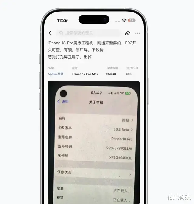 当然目前关于打孔放置在左上角的消息也还未被完全确定,有意思的是在某二手交易平台居然出现了疑似 iPhone 18 Pro 的工程机。