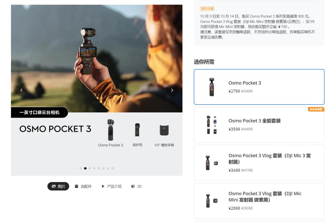 01 降价或有无奈?拆解本轮降价的具体产品来看,大疆本次从10月9日开始持续到10月14日的降价幅度的确不少,其中Pocket 3标准版直降700元(3499→2799元),Action 4最高降1129元,Mini4 PRO降价1478元。