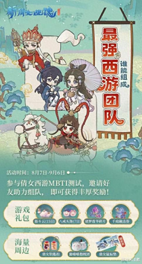 前方急报!8月7日,倩女西游MBTI测试上线了,各位玩家们终于可以测测自己的西游真身了!唐僧、孙悟空、白龙马、猪八戒、姥