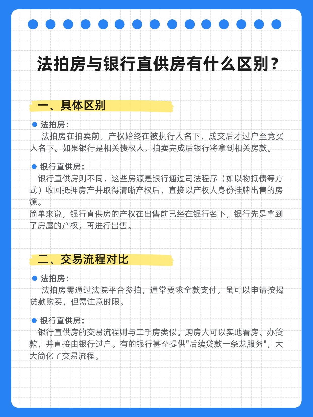 法拍房和银行直供房。这两种房源虽然都是通过某种方式进入市场,但它们之间存在显著的差异。小德今天就详细解析法拍房与银行直供房的区别,为大家提供一份清晰的购房指南。