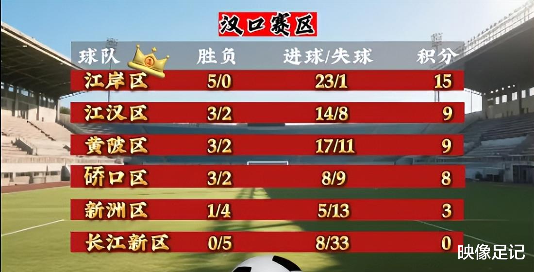 最终,江岸区5战全胜,进23球失1球的战绩夺得汉口赛区的冠军。