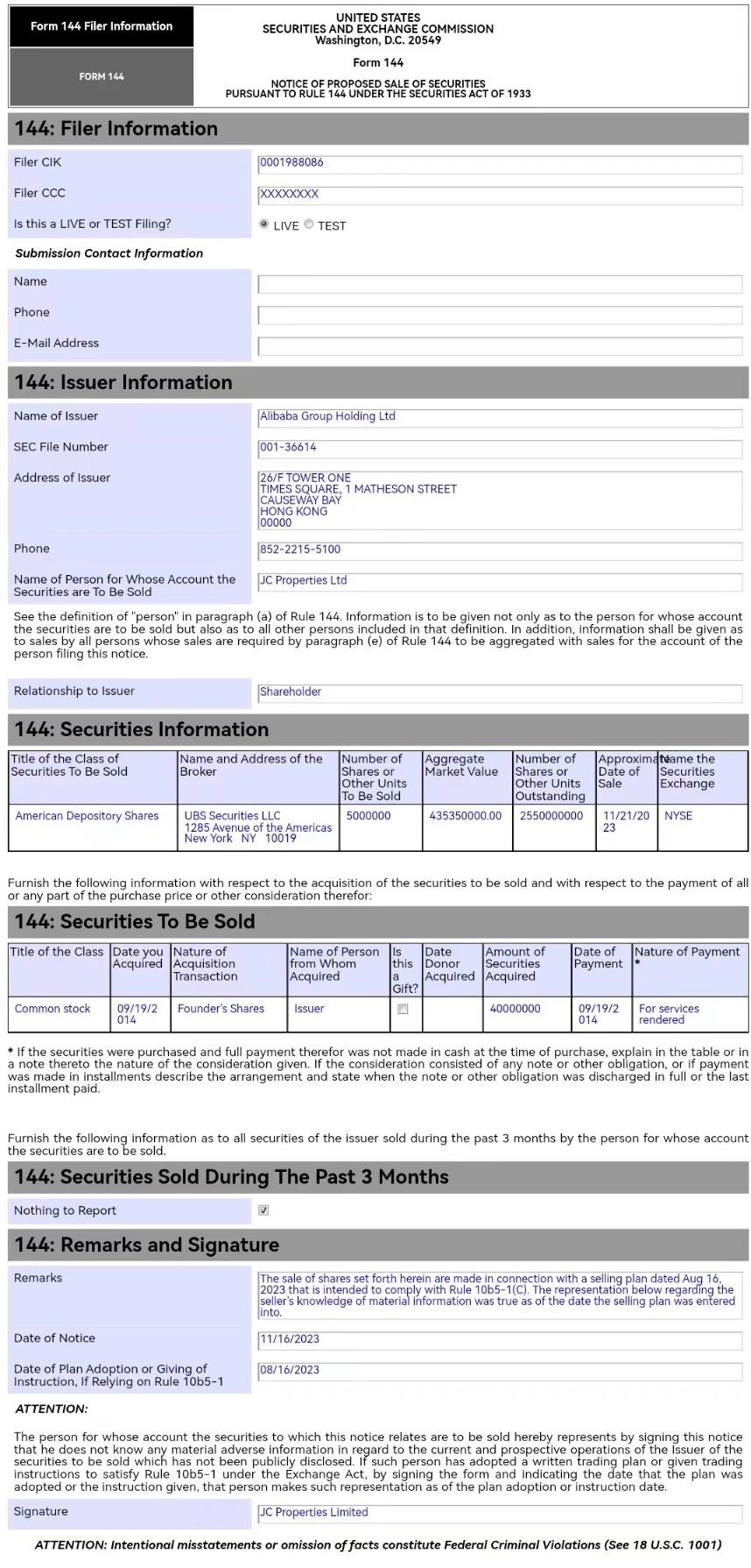 据美国证交会(SEC)官网披露的144文件显示,马云家族信托JC Properties Limited (一家英属维尔京群岛公司) 和 JSP Investment Limited (一家英属维尔京群岛公司) 拟于11月21日分别减持5,000,000股阿里巴巴创始人股份,共涉及股票市值8.707亿美元(当前约 63.13 亿元人民币)。