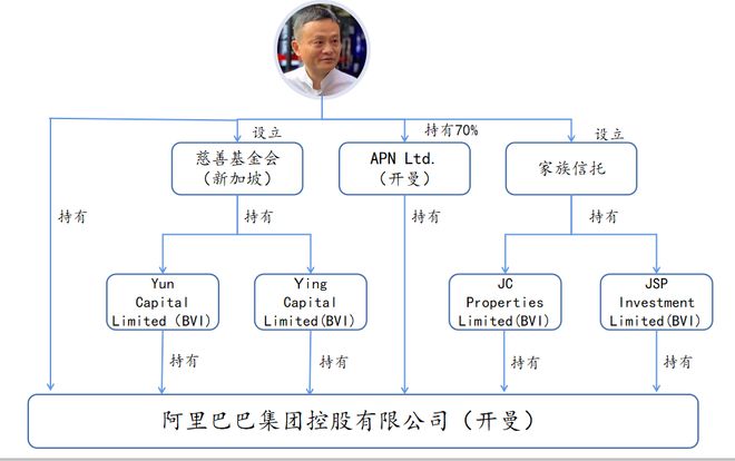 马云的家族信托以马云作为委托人,马云和他的家人作为受益人,通过家族信托控制JC Properties Limited(BVI)和JSP Investment Limited(BVI),再由这两个BVI公司最终持有阿里巴巴集团(开曼)的股份。