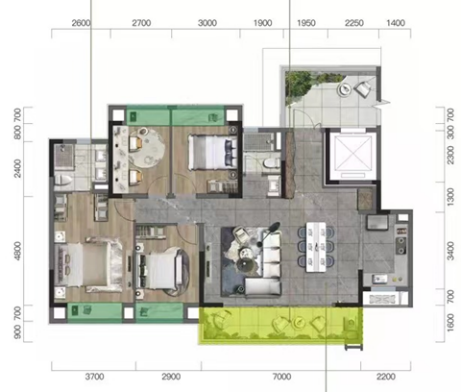 三个次卧的进深尺度最小都达到了3.5m,这样的尺度无疑在未来家具的选择与布置上更为灵活。