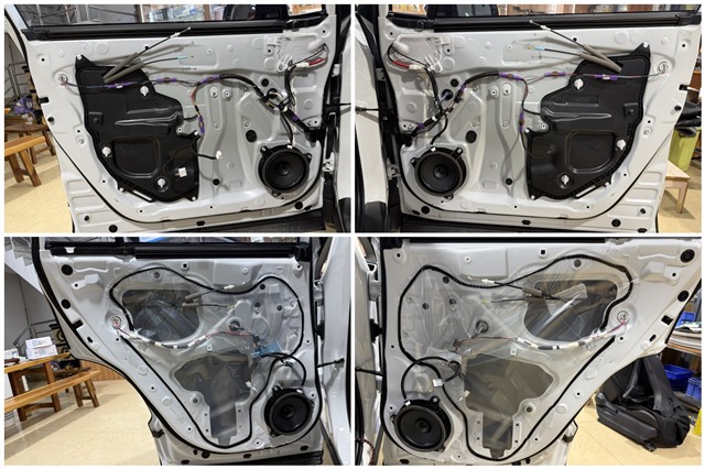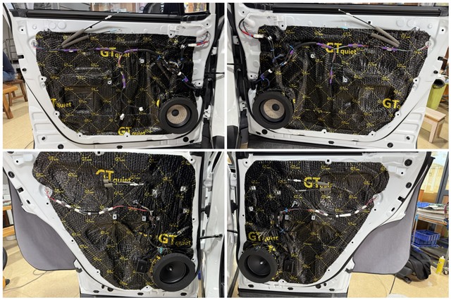 原车门板仅有一层薄弱的防水膜,无法抑制振动和噪音。我们将其清除后,使用GT隔音材料进行了标准的三层隔音处理,完成第二层隔音时,我们还将劲浪喇叭在前后门板进行了原位无损安装,还加装了美音圈,使声音集中起来。