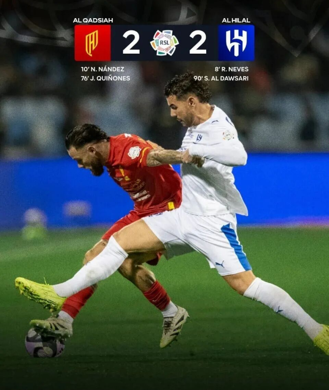 随后,领头羊利雅得新月登场,客场挑战状态火热的胡拜尔库迪西亚队(赛前各项赛事7连胜)。新月队由鲁本·内维斯在第8分钟远射首开纪录,但主队迅速由南德斯扳平。下半场,新月队错失了由萨勒姆主罚的点球(击中门柱),反而被对手由基尼奥内斯反超比分。直到第80分钟,萨勒姆将功补过扳平比分,利雅得新月才艰难地以2-2带走一分,避免了失利。这是他们连续第二轮联赛未能取胜。