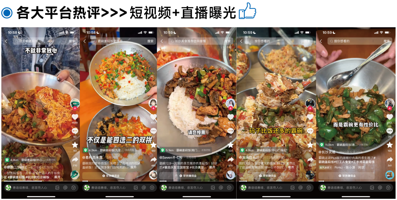 通过“每年超5亿人次曝光”的全渠道营销矩阵(小红书爆文、大众点评热评、短视频直播等),霸碗精准触达年轻客群,线上评论高频出现“食材新鲜”“味道正宗”“性价比高”等关键词。同时,门店以“温暖烟火气”为主题,升级VI系统与IP形象,打造兼具实用性与社交属性的消费空间,强化“长沙盖码饭连锁开创者”的品牌认知。