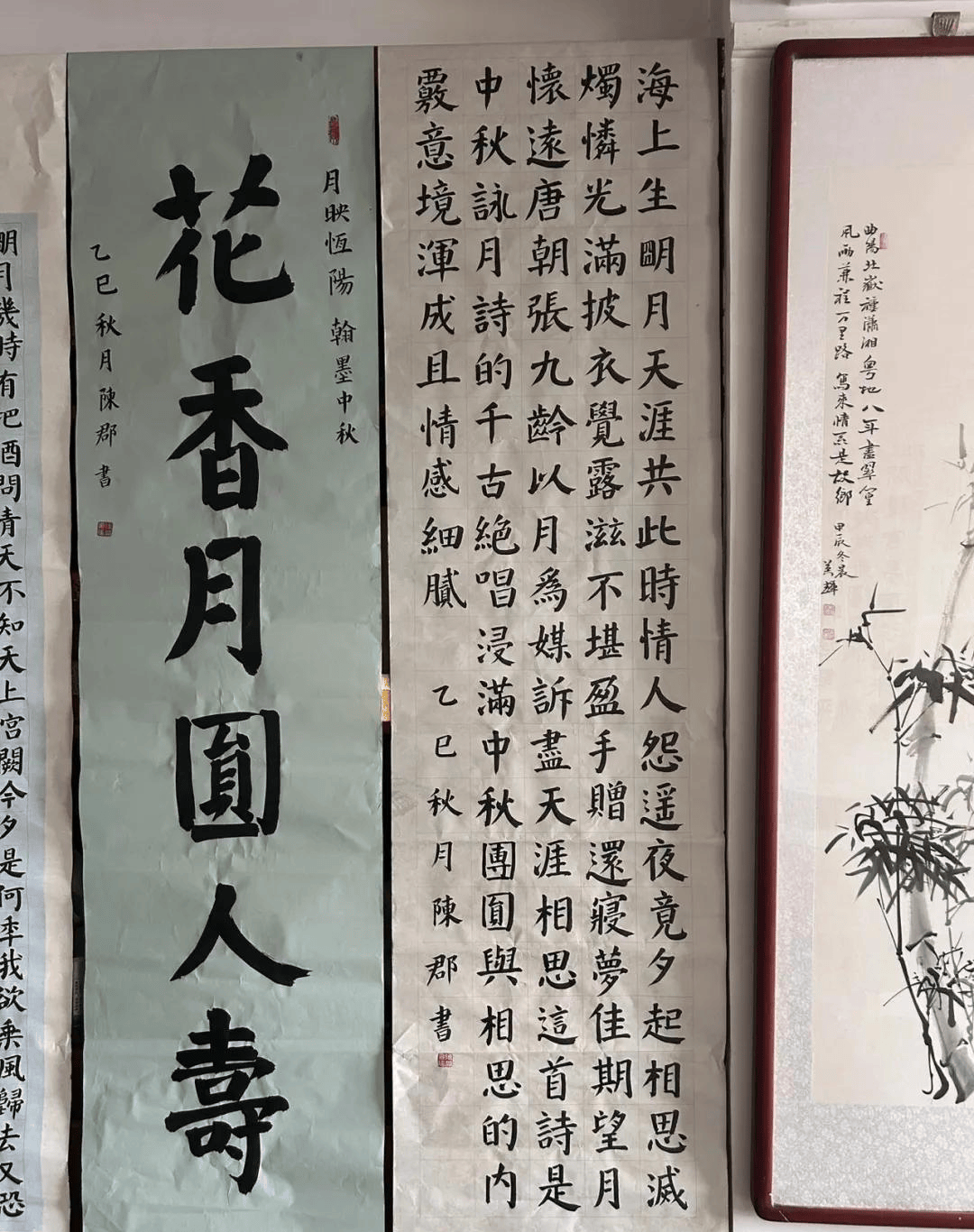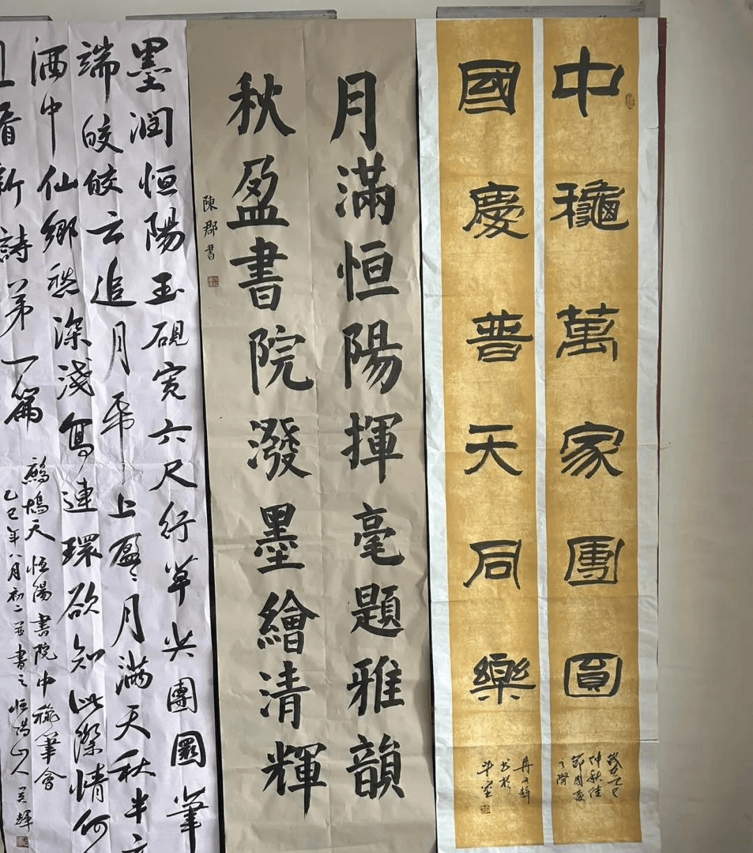 走进恒阳书院的展厅,满墙的书画作品如中秋月华般铺展开来。有苍劲有力的书法,将“海上生明月,天涯共此时”的相思写得淋漓尽致;把“丹桂飘香、玉兔捣药”的中秋意趣晕染在宣纸上;有创作者自撰的诗词楹联,在笔墨间勾勒出独属于恒阳的中秋韵味。