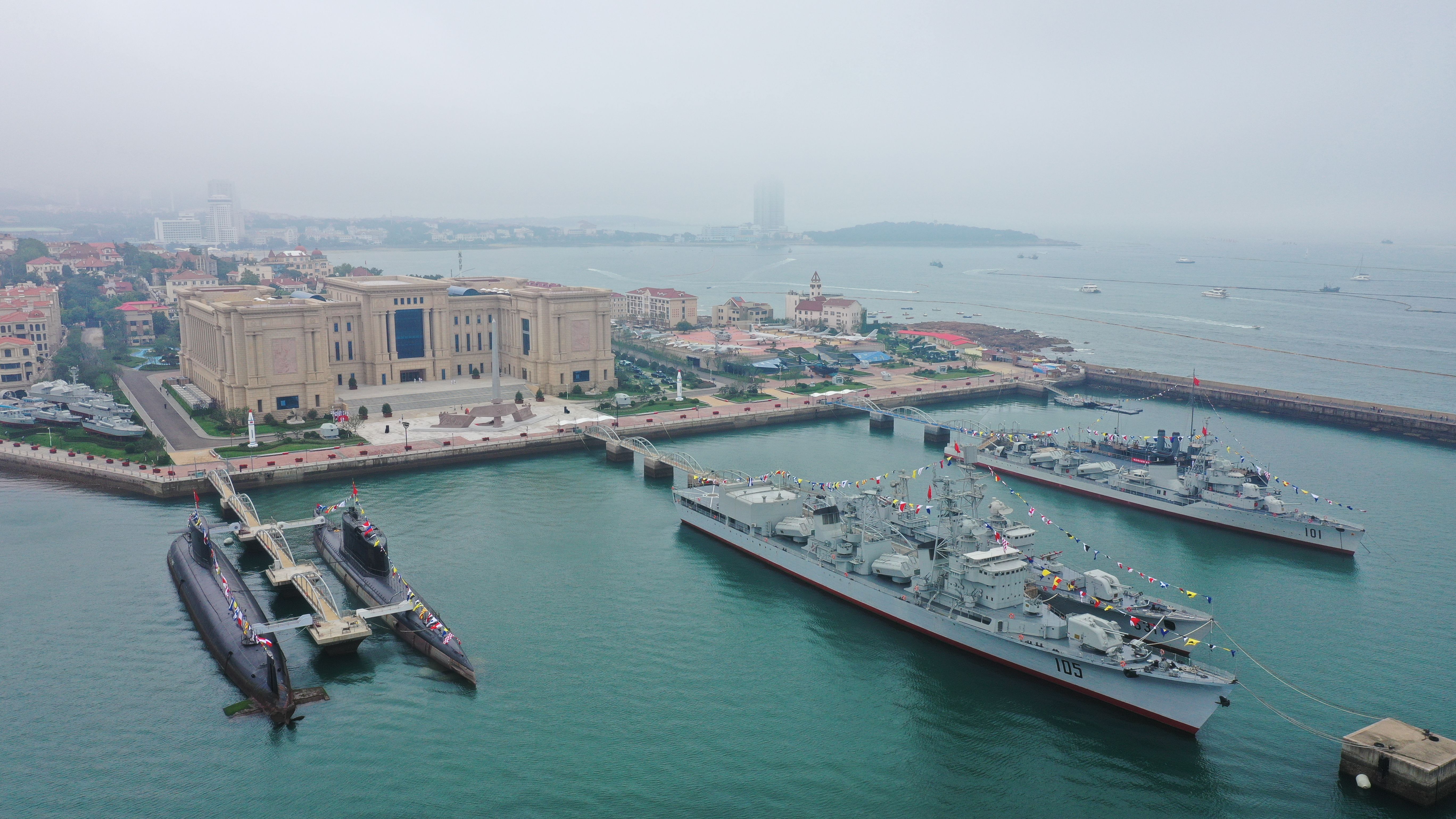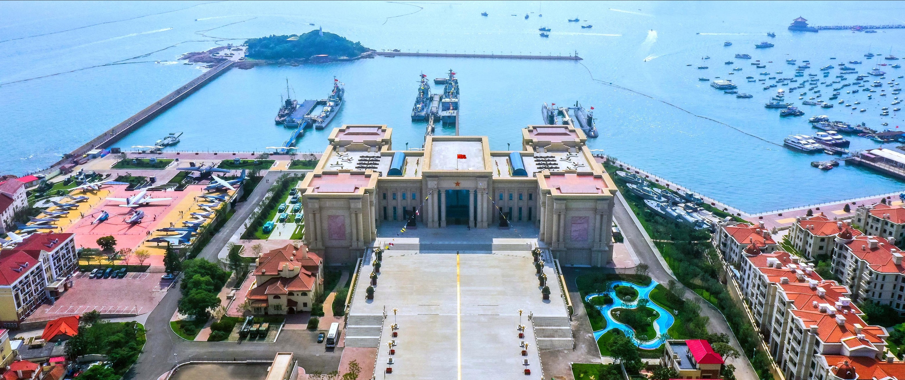 海军的“天安门城楼”,则是承担着历史与使命融汇点的青岛海军博物馆。海博隔青岛湾相对的沂水路太平路上,多有当年列强海军盘踞之残巢在时刻提醒着:耻辱百年间消逝的无数生命、财富的创伤,至今尚未愈合;海博内部陈列的众多舰艇和武器,是新中国海军从无到有、由弱到强光辉奋战历程的真实写照;青岛湾畔的回澜阁和栈桥广场,将这座海滨城市的记忆与海洋情怀熔铸在一起,成为民众感知海军发展的 “情感纽带”;海博馆内原封保存着教员对人民海军充满期待的题词手稿,则启发每位参观者个人奋斗、国家命运与海洋战略该如何关联。海博这座专注于远眺海洋彼岸的精神殿堂,比任何建筑都更能给中国的海军力量注入灵魂。