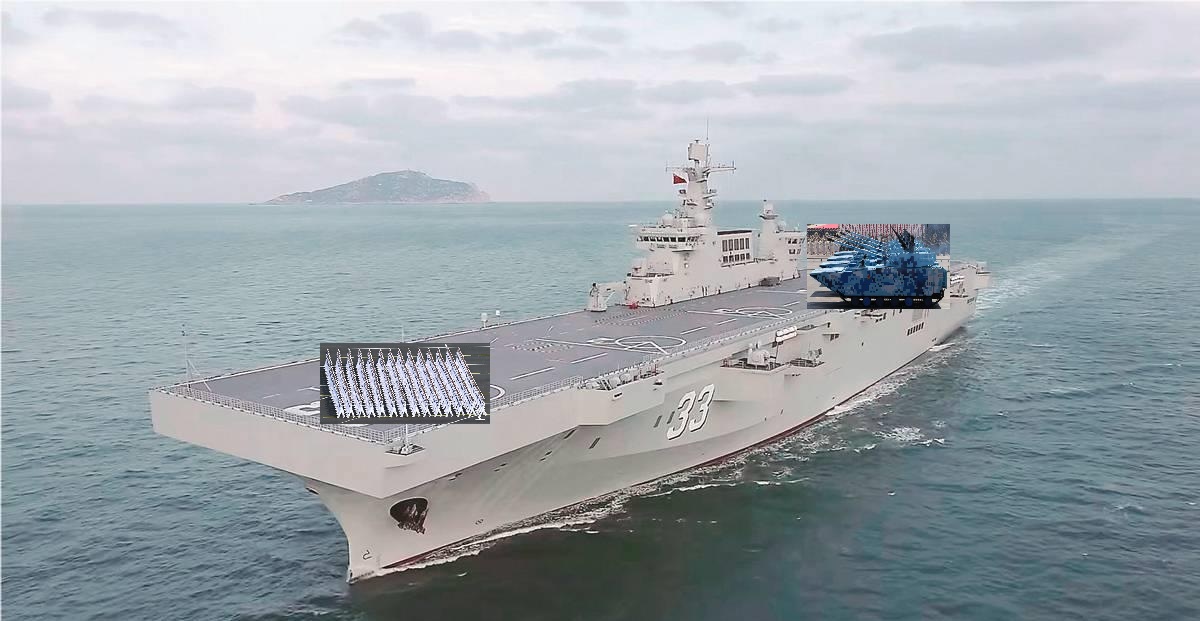人员方阵在受阅之后,从075舰艏小型升降机返回机库内待命,两栖突击战车、两栖步兵战车及轮式自行火炮,则从075的舰艉大型升降机陆续升上甲板,排列编组成方队接受检阅。我军列装的水中兵器如无人潜航/布雷器,则在各艘075舰宽阔的坞舱内,以实战状态进行展示和受阅。