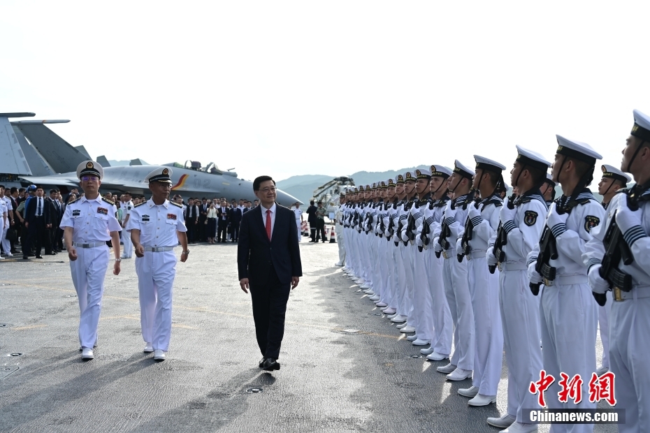 在甲板上受阅的人员方队,由海军水面舰艇部队、潜艇部队、海军航空兵部队、海军岸防部队和海军陆战队分别编成,前四个兵种官兵们身着海军白色礼服、手持新式步枪、正步行进接受检阅,承担渡海实战刀锋使命的海军陆战队官兵方阵,则身着实战迷彩服、手持全副实战化武器、便步行进接受检阅。