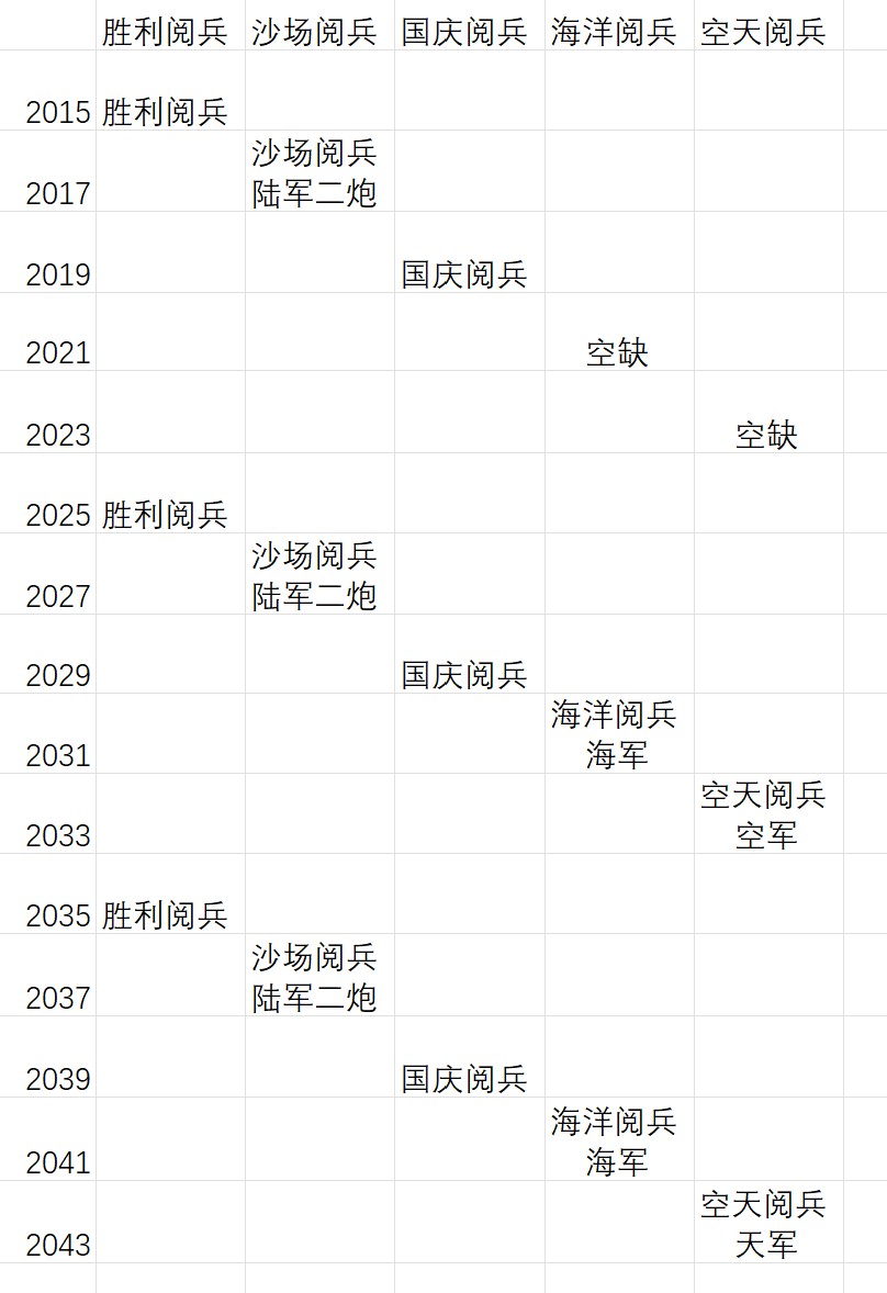 所以,建议在2031年举办以海军为主题的海洋阅兵,在2033则可以举办以空军或天军为主题的空军/天军阅兵,自然的衔接上2035的第三届胜利阅兵,使我国的阅兵制度完善为每2年举办一次,5次组成10年一轮,且每次阅兵都能按主题获得科学合理的安排。