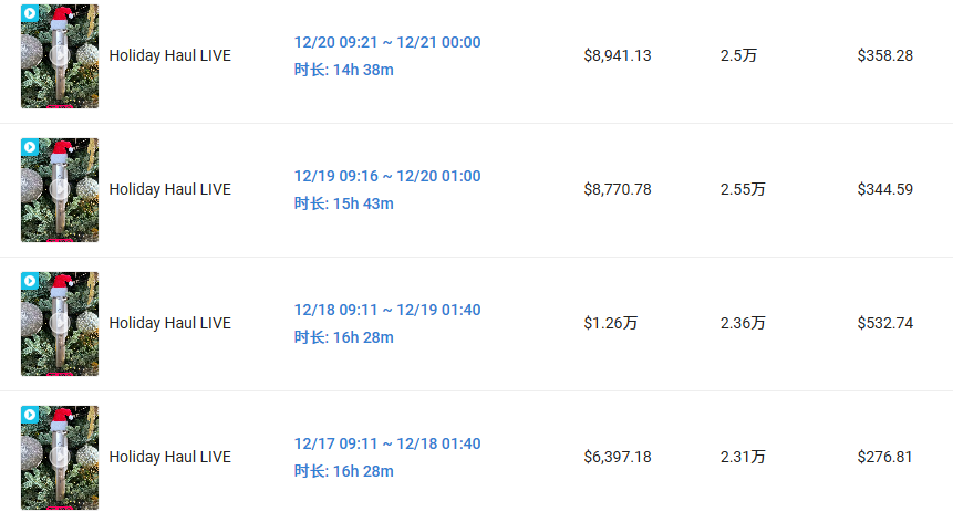 如下图所示,在年终大促期间,@tymobeauty_official的直播间几乎达到了每一日的连续覆盖,单场直播时长均超过14小时,形成了持续的品牌曝光与销售热度。