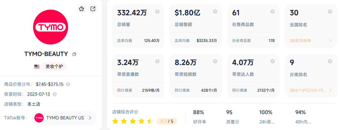 截至2025年末,TYMO BEAUTY品牌在TikTok Shop美区的销售额共计达到1.8亿美元,总销量为332.42万件,实力不可小觑。