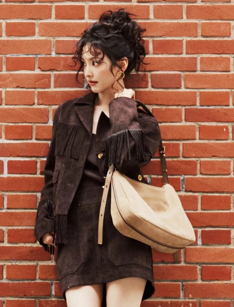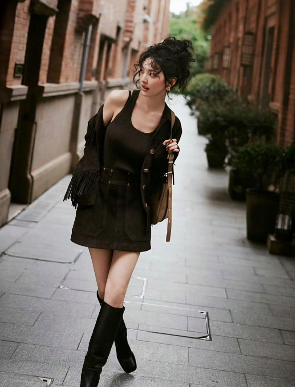 就连日常私服也成为她的时尚试验场。一组蓝白配色造型引发全网模仿:oversize衬衫与A字连衣裙的搭配,通过材质对比打造出“蓝天白云”般的自然清新感。 这种“看似简单,实则心机”的穿搭哲学,让普通女孩也能复刻她的仙气。 而在千禧风造型中,她又用oversize皮夹克混搭透视纱裙,用妈妈年代的珍珠发卡增添复古细节。