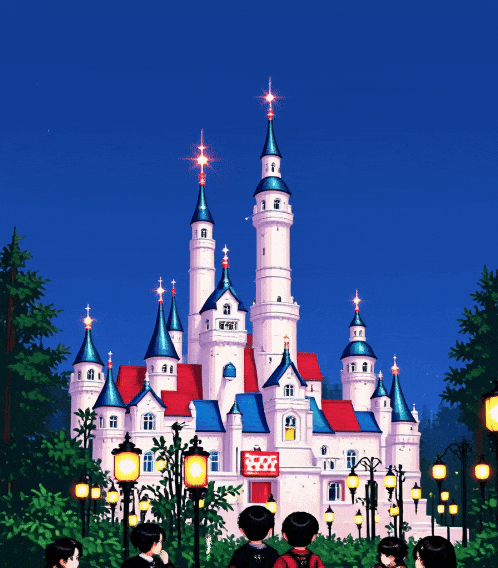 我先是上传了一张迪士尼真实城堡的图片,让AI帮忙转绘为超级可爱浪漫的像素插画风视频: