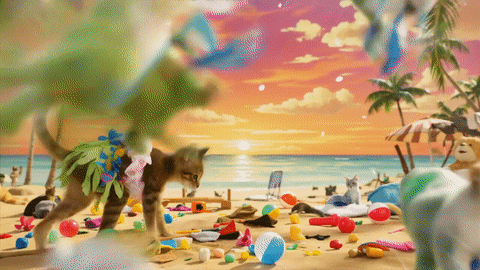 Prompt:生成一只穿着草裙在热带海滩上跳舞的可爱小猫视频,风格为卡通明亮,背景有棕榈树和夕阳。