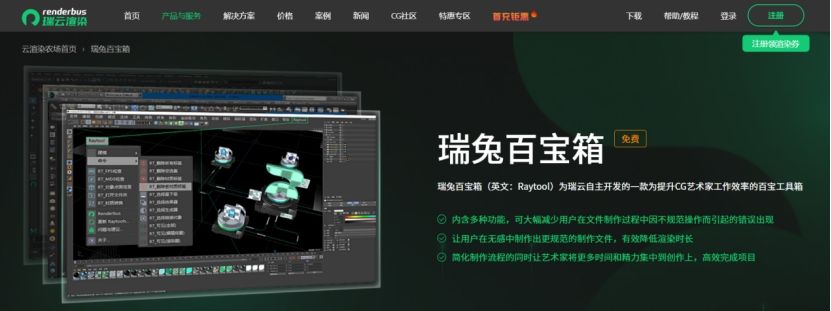 瑞兔百宝箱(英文:Raytool)是瑞云渲染自主开发的免费 CG 工具集,专为提升 3D 渲染师工作效率设计,目前重点支持 3ds Max(2012-2024 版本),并且也已拓展至 Maya、Cinema 4D 等主流软件,本文主要聚焦针对3ds Max云渲染流程的优化。