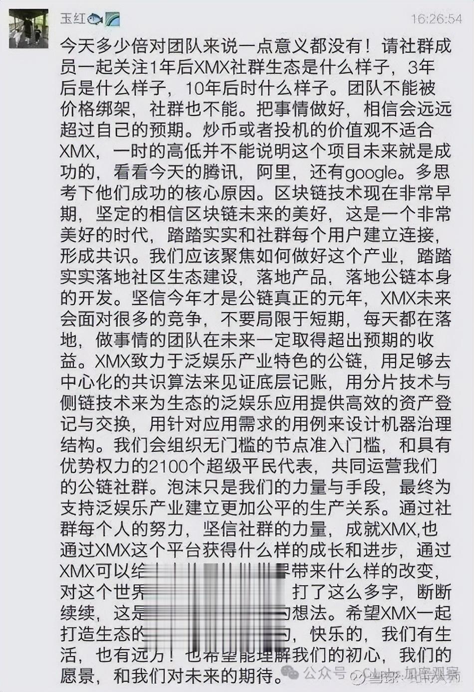 XMX上线之后,币价在转瞬之间便急剧暴跌。这一案例,成为2018年“社群币模式”典型失败范例之一。然而,这并不意味着玉红就此退出了这场资本博弈的牌局。