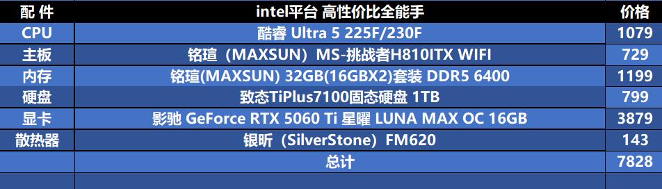 主板选择:ITX装机可考虑铭瑄H810ITX等主板;若使用M-ATX机箱,B860主板扩展性更好。