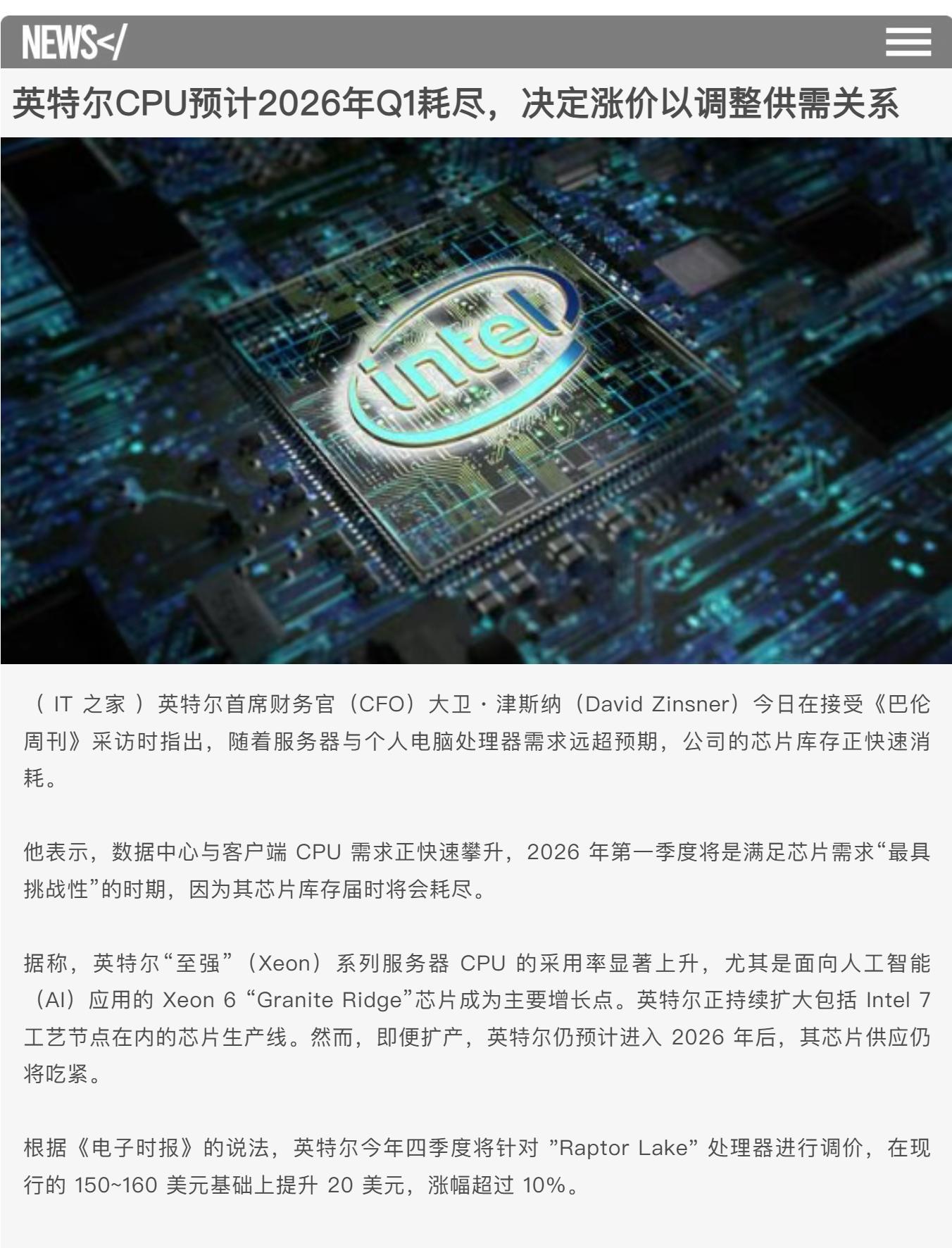不过刚看到消息,受AI需求的影响,intel的旧U库存也将在明年第一季度耗尽,新U的产能可能也会被企业级需求抢走,会对消费级市场产生一定的冲击,也有涨价趋势。