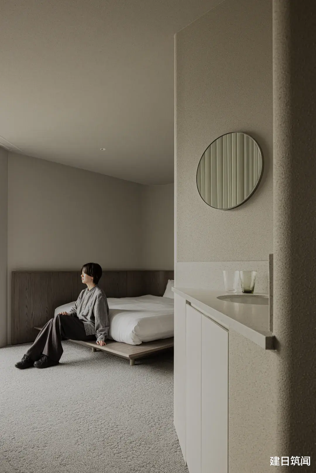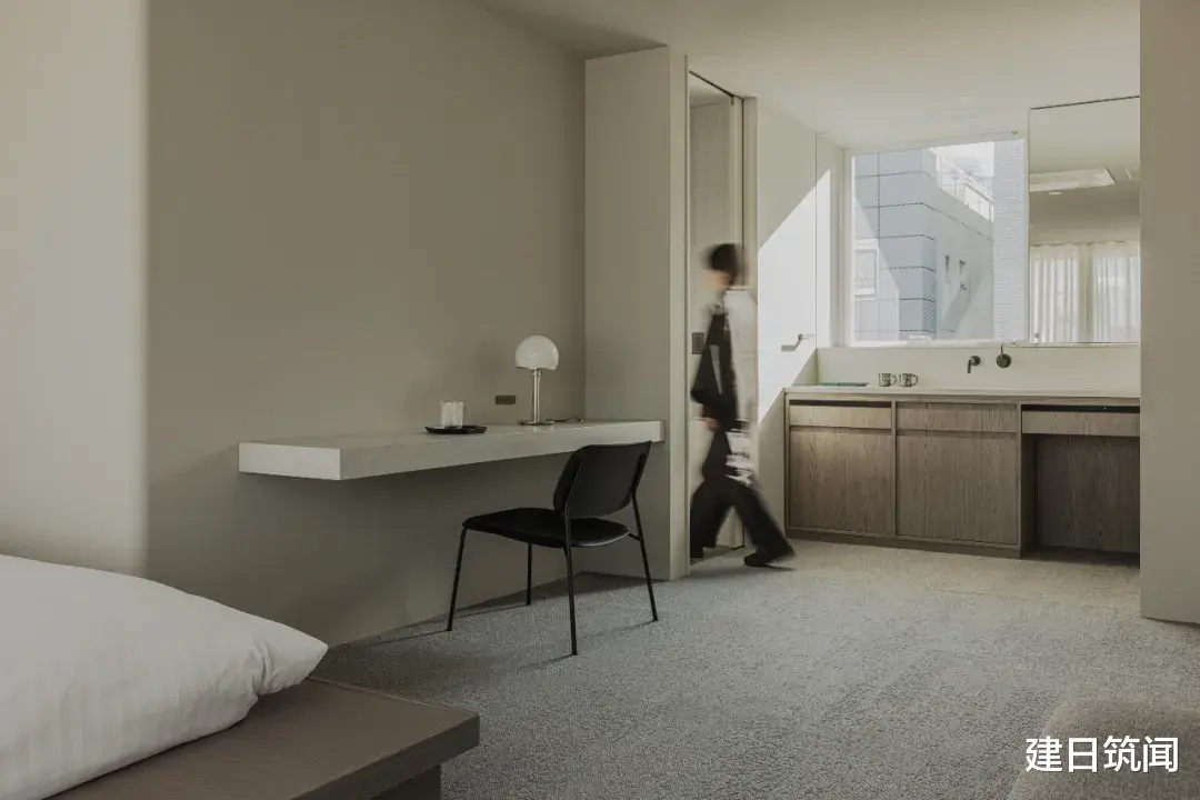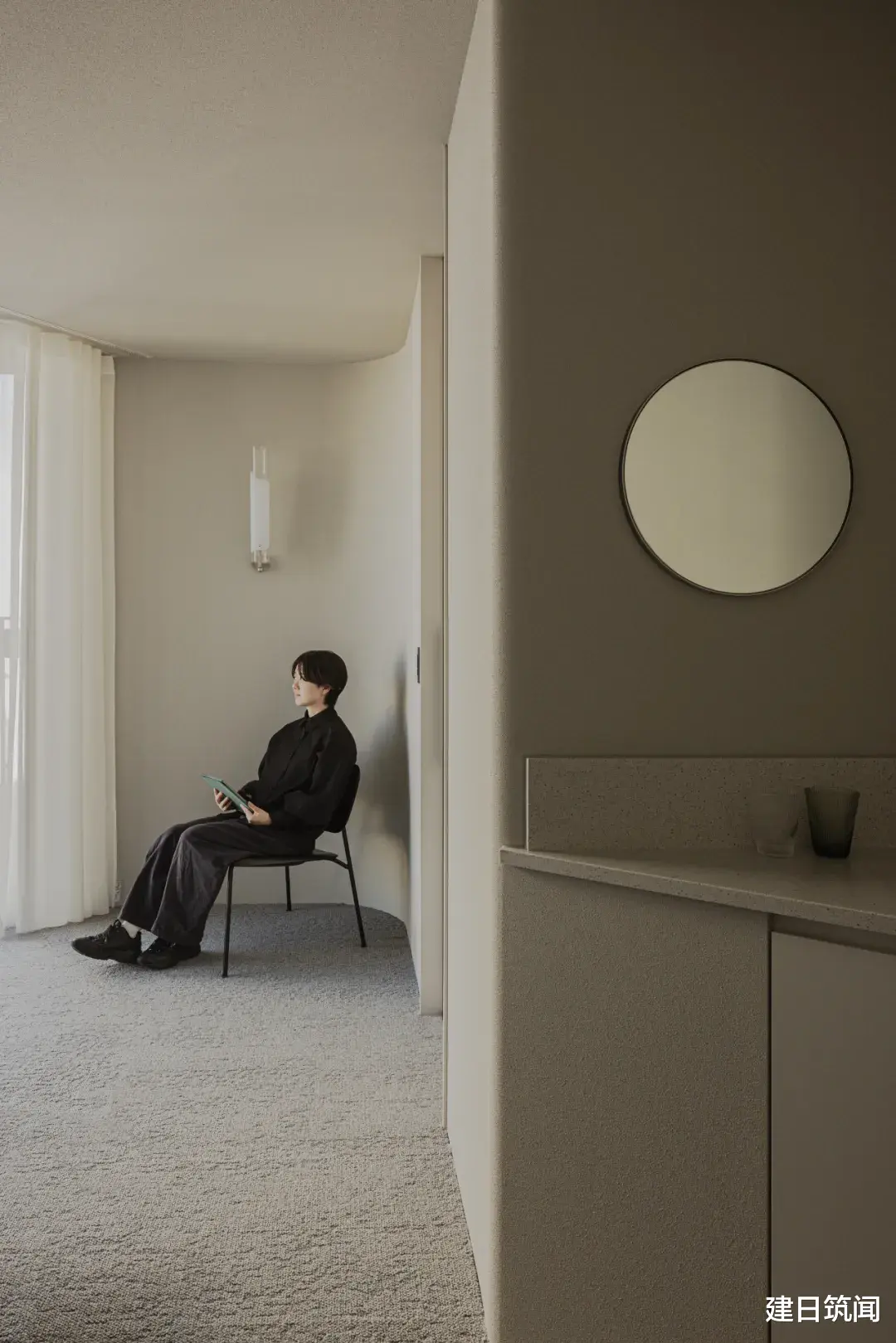 无缝空间与曲面墙构成客房基调。硅藻土壁纸的微孔肌理与弧形墙共同散射光线,柔化室内氛围。浴室布局兼顾隐私与舒适:淋浴区远离开口,洗脸盆外移,避免局促感。这一设计在中央区办公密集环境中尤为重要。