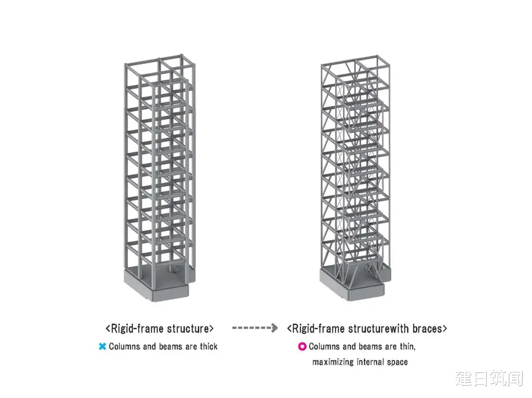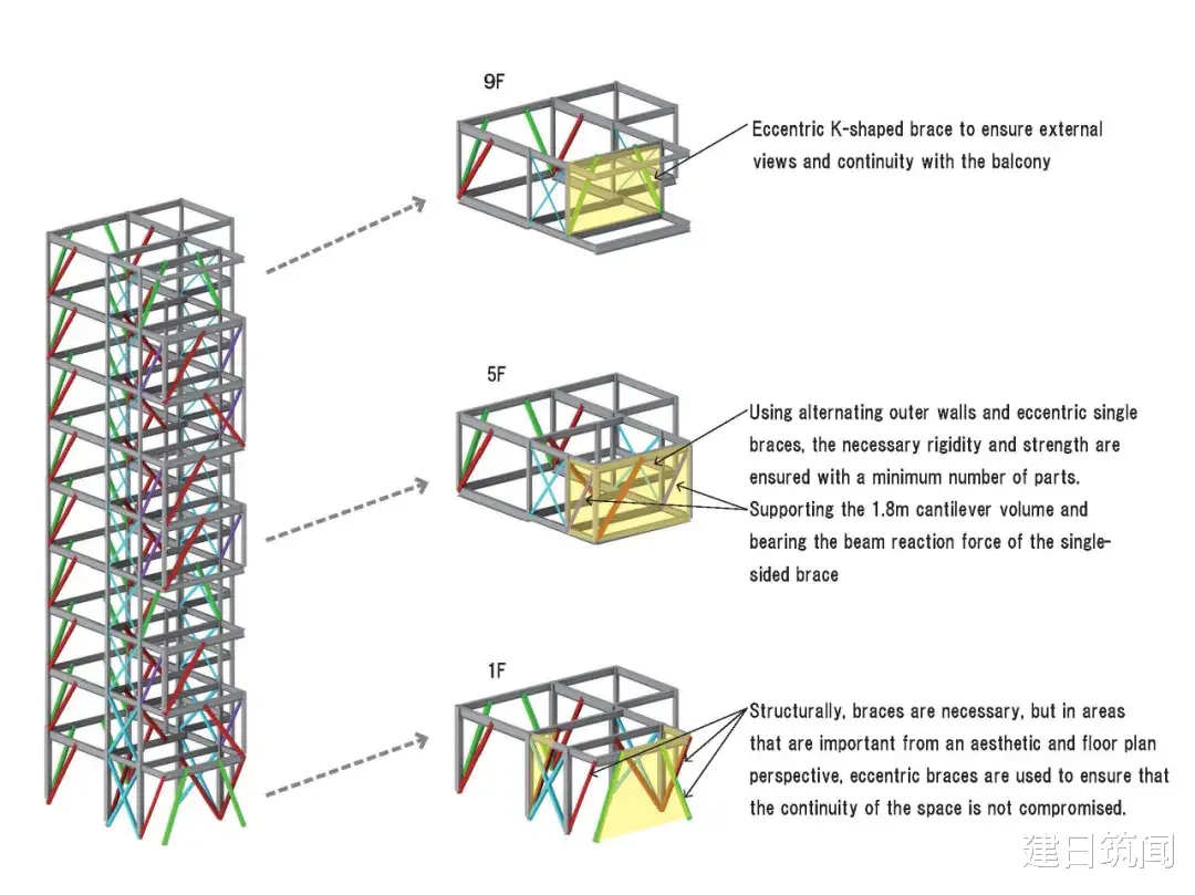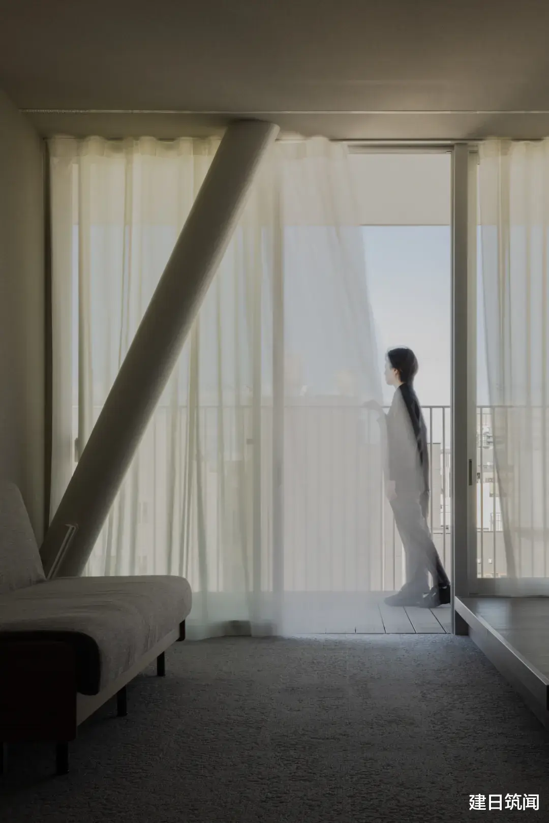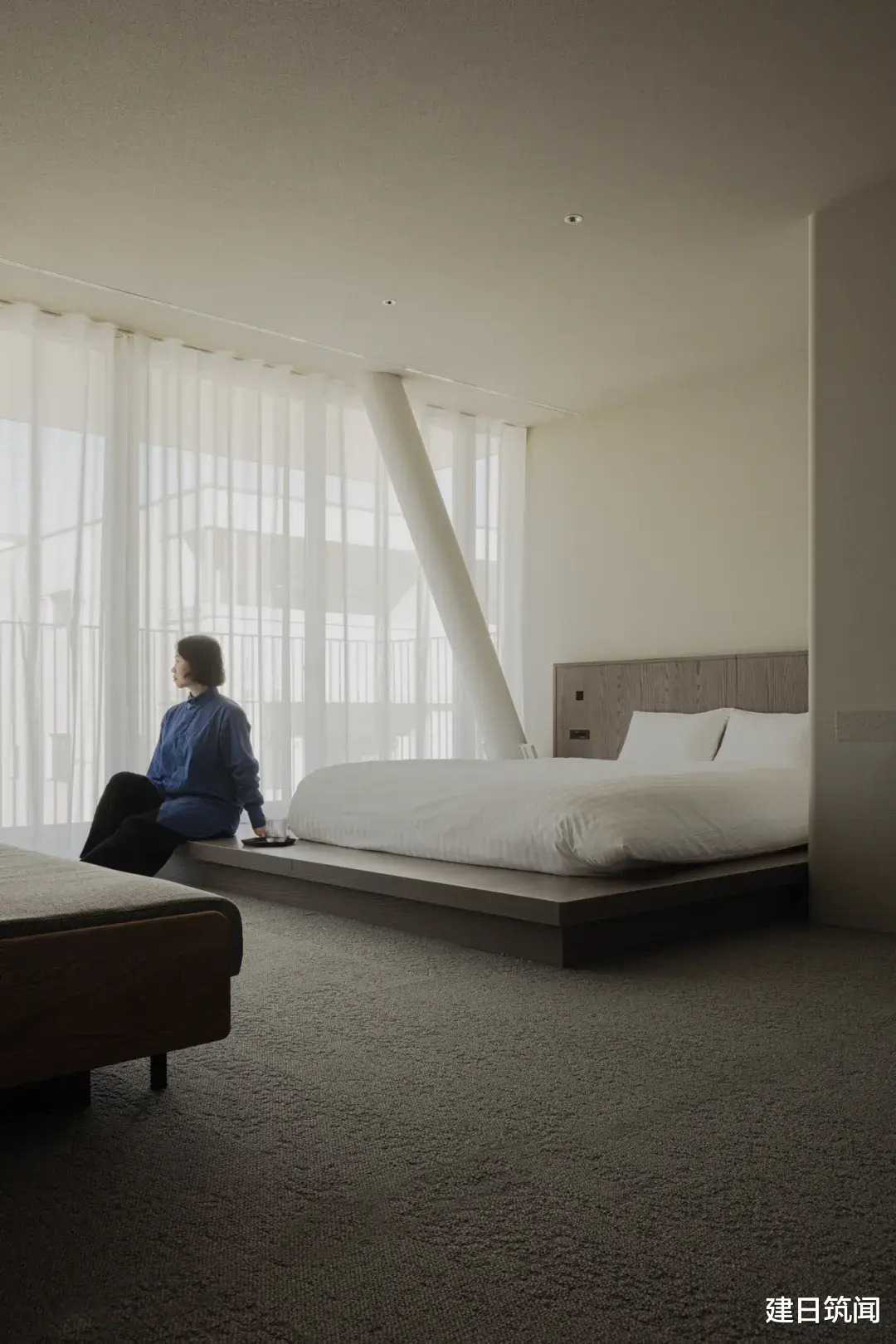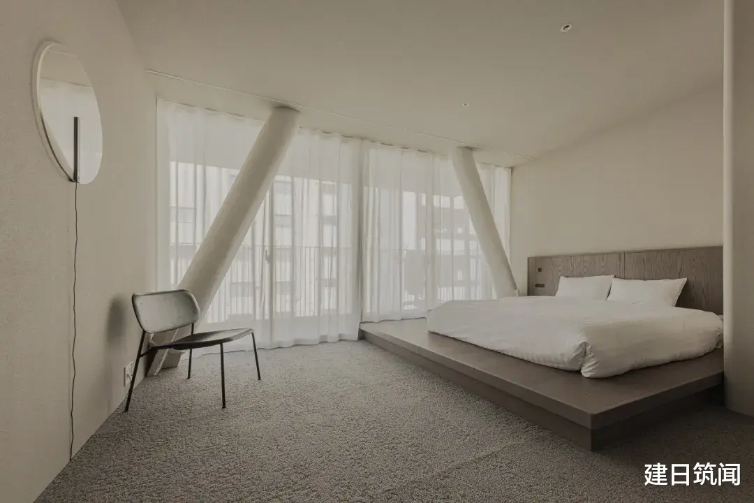 建筑采用带斜撑的钢框架结构,替代传统柱梁体系。柱子灵活排布,确保阳台无遮挡视野。立面阳台形态多样,有的呈三角形,有的覆盖整开间。柱梁截面极小(梁高 300mm,柱径 150-200mm),隐藏于墙体内,使自然光能沿弧形墙面均匀漫射。客房弧形墙体延伸至室外,模糊内外界限,营造宽敞感。