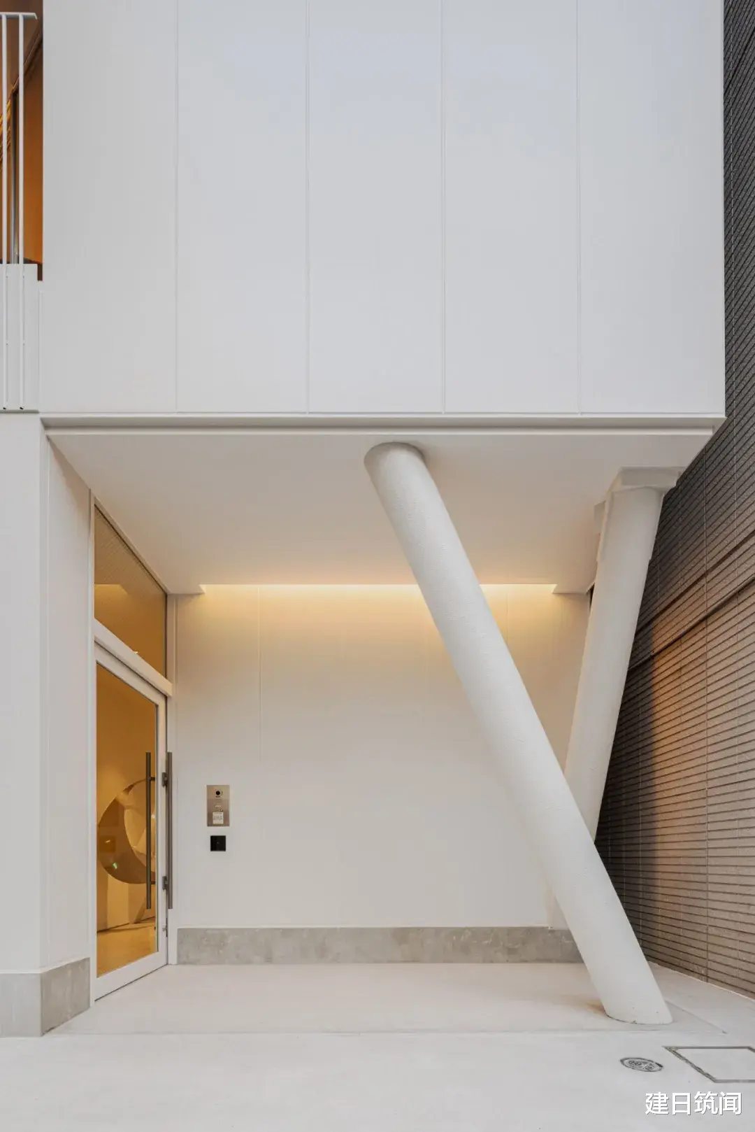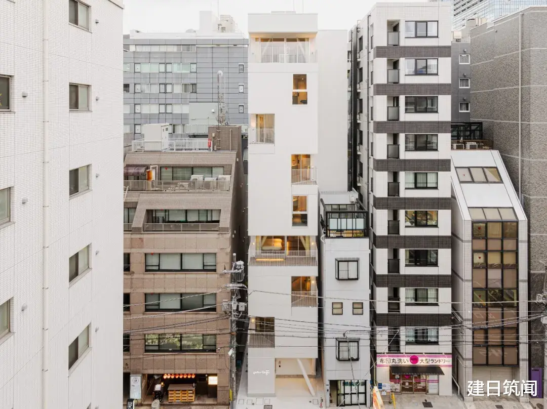 项目位于东京日本桥,周围被东京典型的杂居大楼包围。场地没有像景胜地那样的远景视野,且周边建筑在高度、宽度、材质以及开口形式上缺乏统一的设计逻辑。为了打破“都心狭小用地”这一负面因素,设计团队关注城市建筑之间的缝隙,并以视线的穿透性为设计主题。在这块仅有 84 ㎡ 的狭小用地上,我们需在有限的空间内打造 14 间客房。