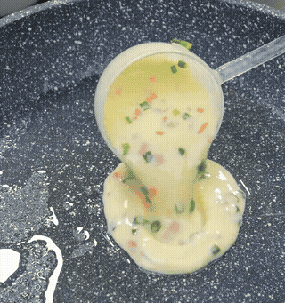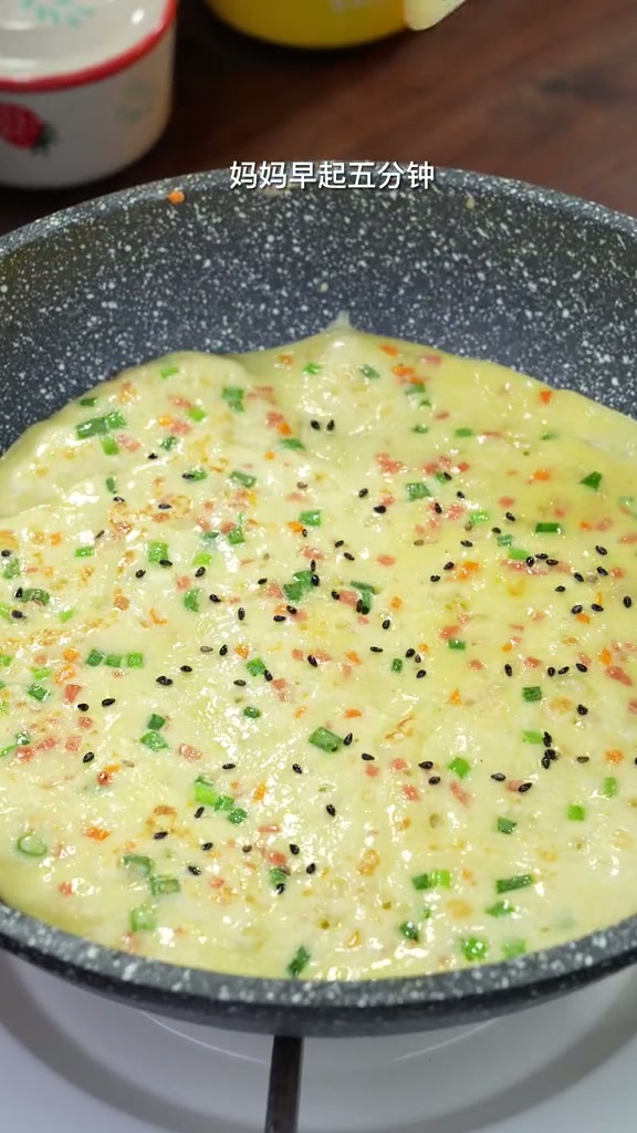 这里加点彩色蔬菜是为了让煎饼看着更有食欲,孩子一看就想吃。火腿丁能增香,胡萝卜提甜,葱花也别省,香气有一半靠它!