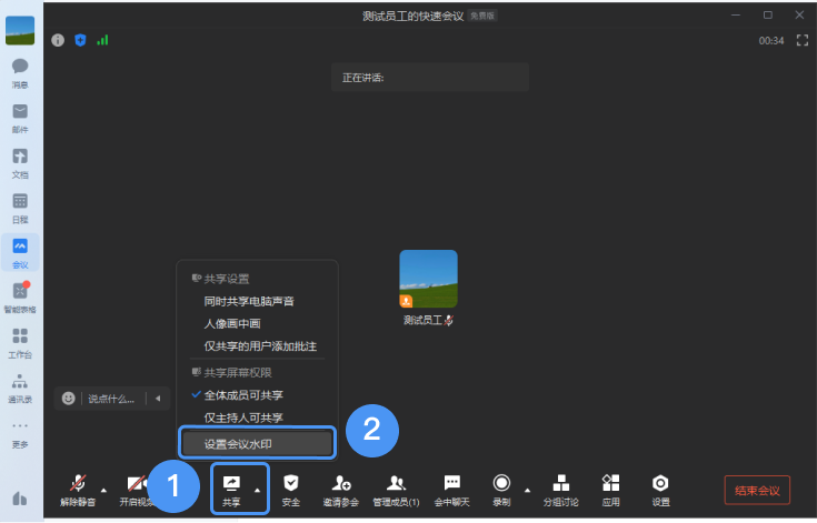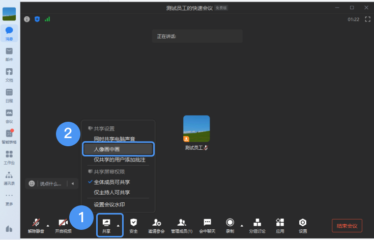 在【共享设置→人像画中画】中开启后,参会人既能观看共享屏幕内容,又能同时看到演讲者的视频画面,增强临场感与互动性。