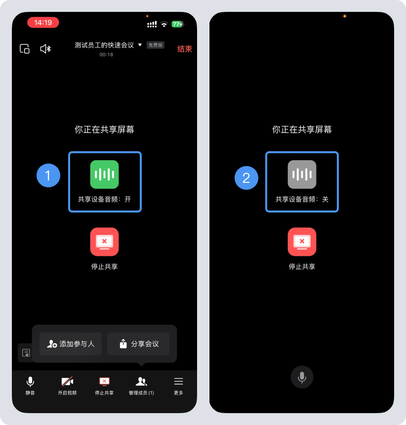 手机端发起共享屏幕,设备音频默认开,支持关闭。