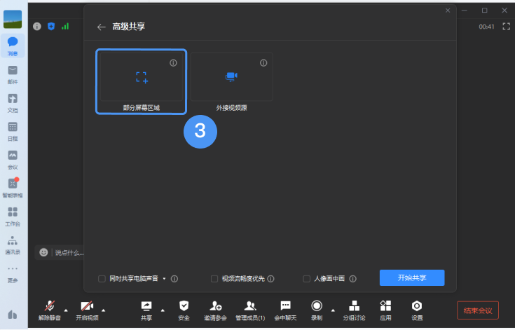 发起共享后,通过【共享屏幕→高级】选项,可自定义共享的屏幕区域,精准展示所需内容,避免干扰信息泄露。