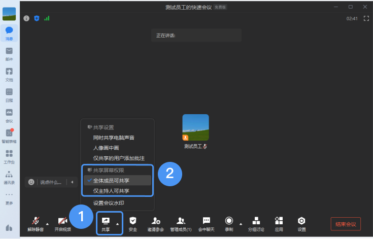 主持人或联席主持人支持选择【全体成员可共享】或【仅主持人可共享】,默认选择【全体成员可共享】。