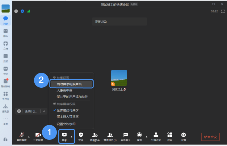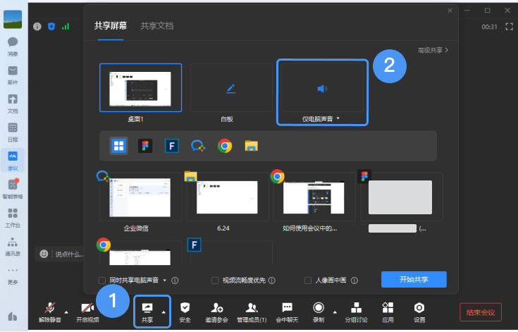 发起共享时,可自主选择是否【同时共享电脑声音】(默认关闭),(暂不支持MAC端)。