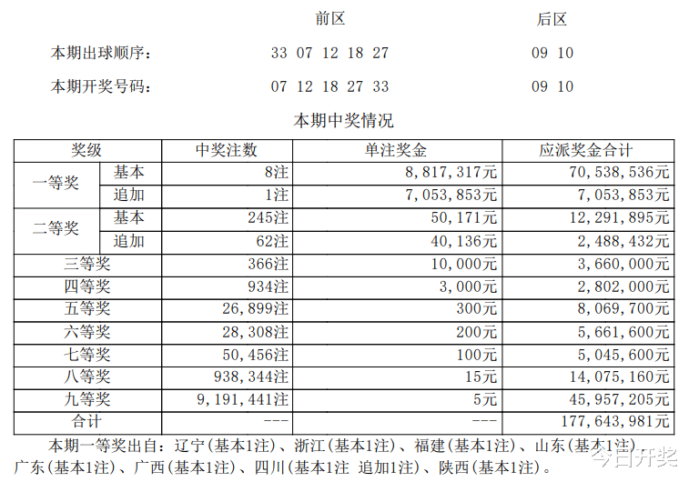本期为大乐透的第25134期开奖,本期全国销售金额:311,134,788元,本期使用第1套摇奖球,本期出球顺序: 33 07 12 18 27+ 09 10,本期开奖号码: 07 12 18 27 33+ 09 10,本期的大乐透前区开出了一个掉号27,一组同尾数的号码07和27,12是跟前面的两期组成一个三斜连号,连号缺席了,后区的倒是开出了一组的连号了,那么开出这样的号码组合全国彩民中奖情况如何了?