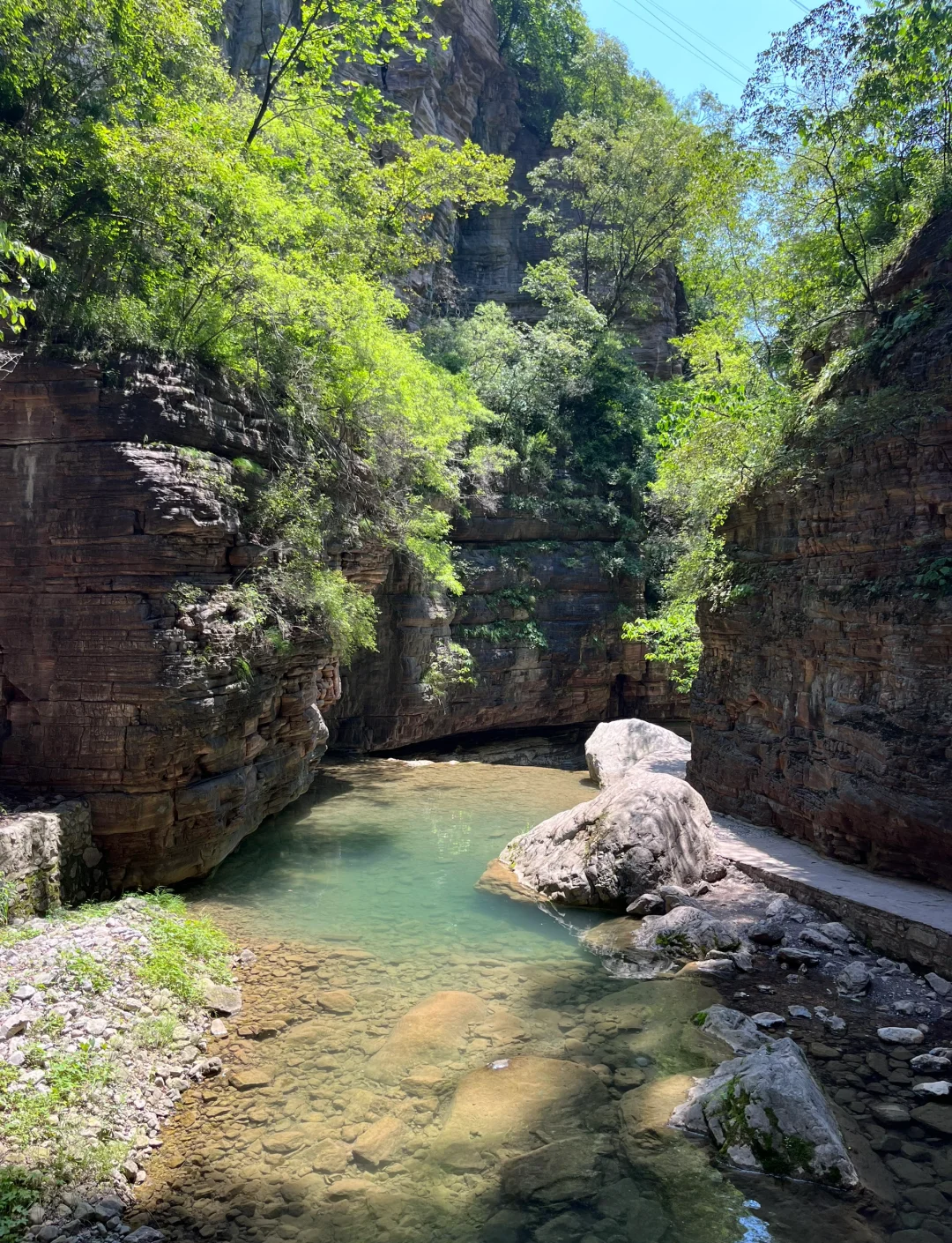 玻璃栈道·云端漫步:全长200米的悬空栈道,脚下是深谷,导游会指认“栈道下的‘青龙潭’”(潭水因矿物质呈翡翠色)。