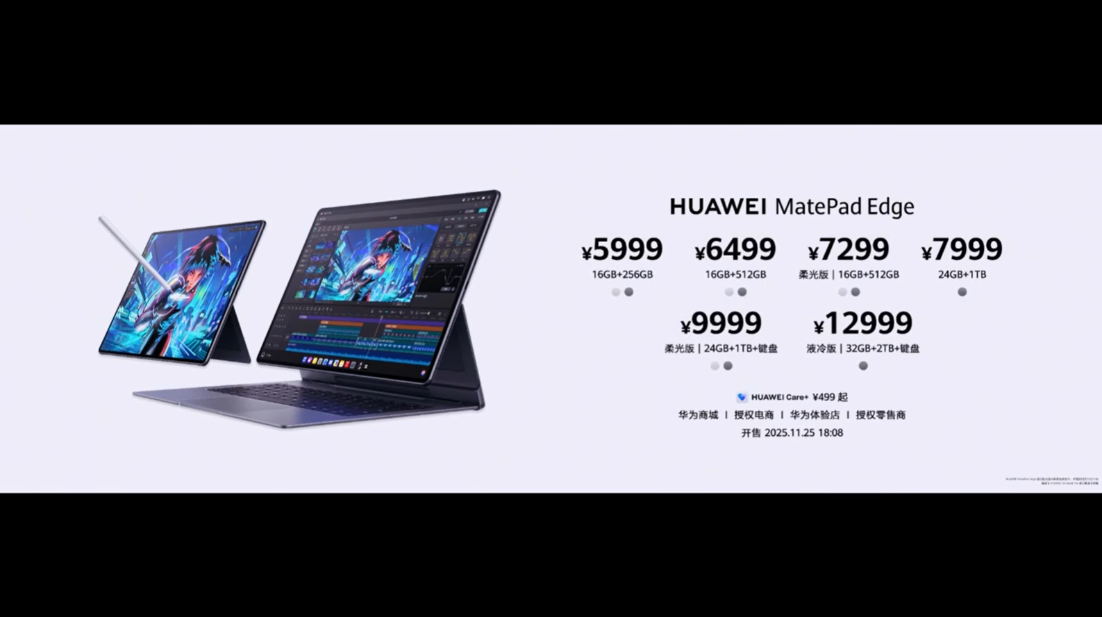 价格方面,华为MatePad Edge基础版16GB+256GB售价5999元,顶配液冷版32GB+2TB+键盘则高达12999元,提供柔光版等细分版本可选。