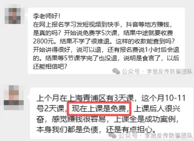 此类骗局在各个短视频平台上大肆推广,前期声称可免费学习,后期推出“进一步”课程进行收割。