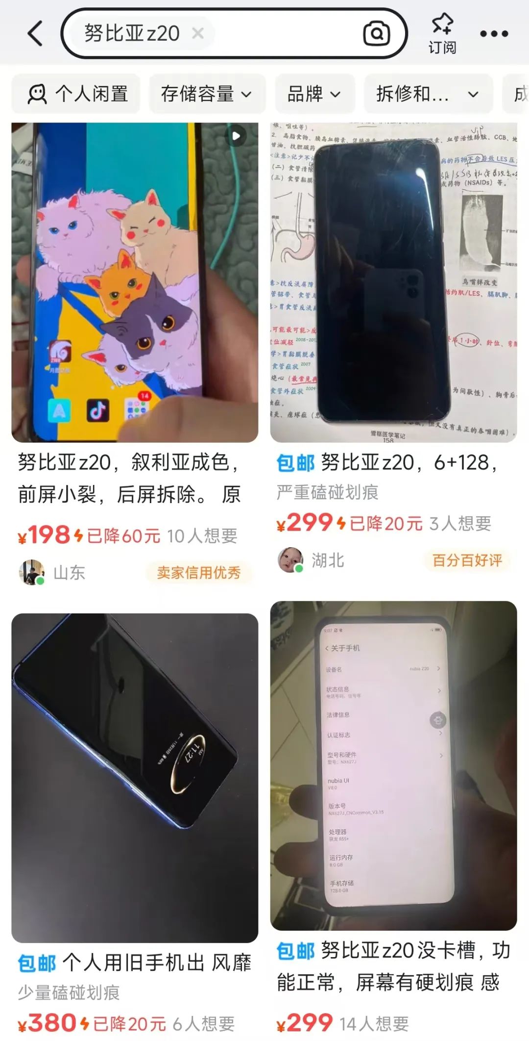 但在二手圈,由于努比亚Z20的副屏很容易损坏,有些是摔坏的,有些是故障导致不亮屏,甚至有人把副屏拆除后,只用主屏。这就造成了它有大量二手残次机,价格便宜到离谱。