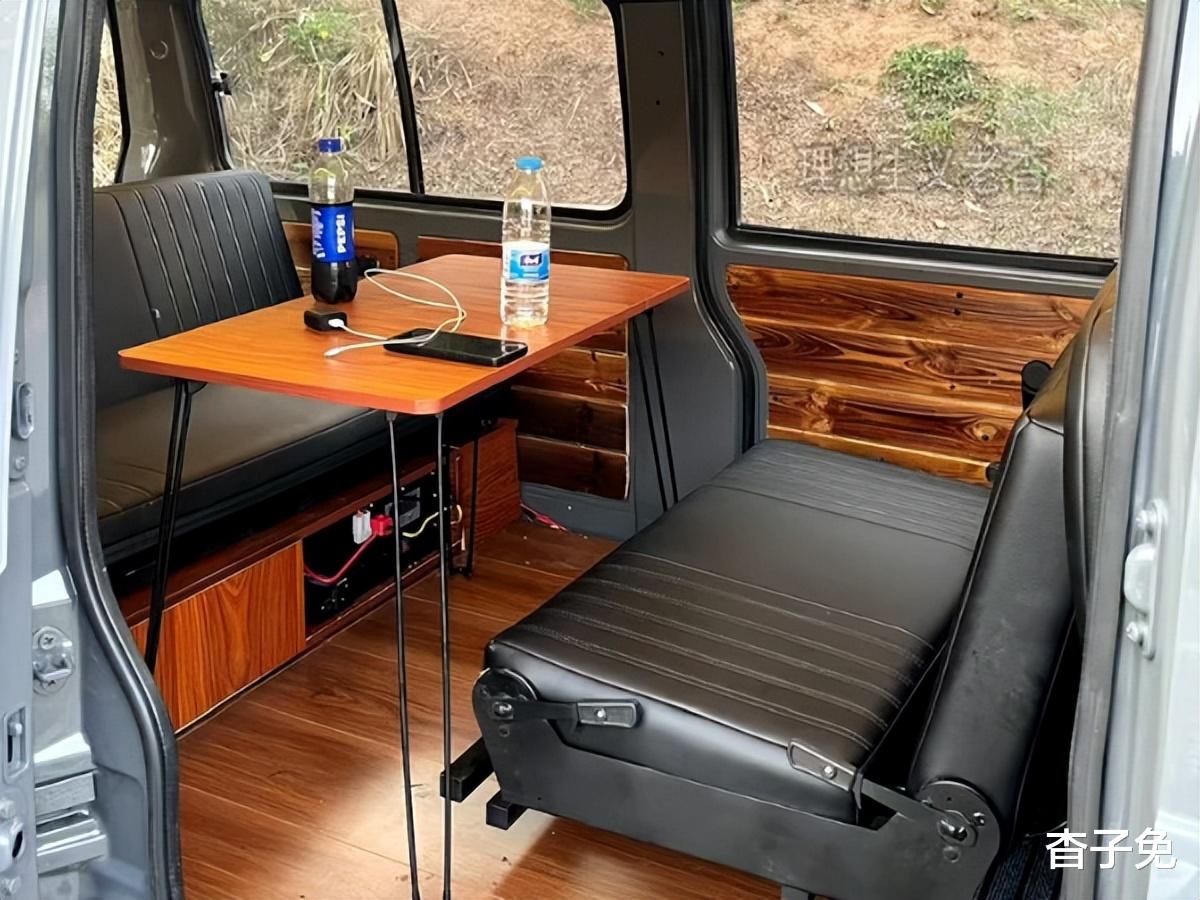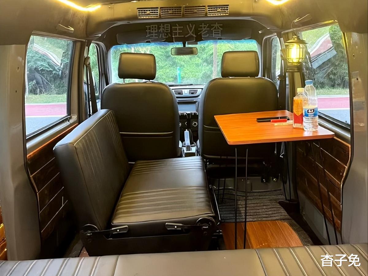 打开右中门,车内实木砌墙铺地,营造复古居家氛围,中后排座椅换成了床车专用椅,中排座椅已向后旋转,与后排形成对座,中间添置了一张高脚桌,组成车载小客厅,是日常喝茶吃饭聊天的地方。