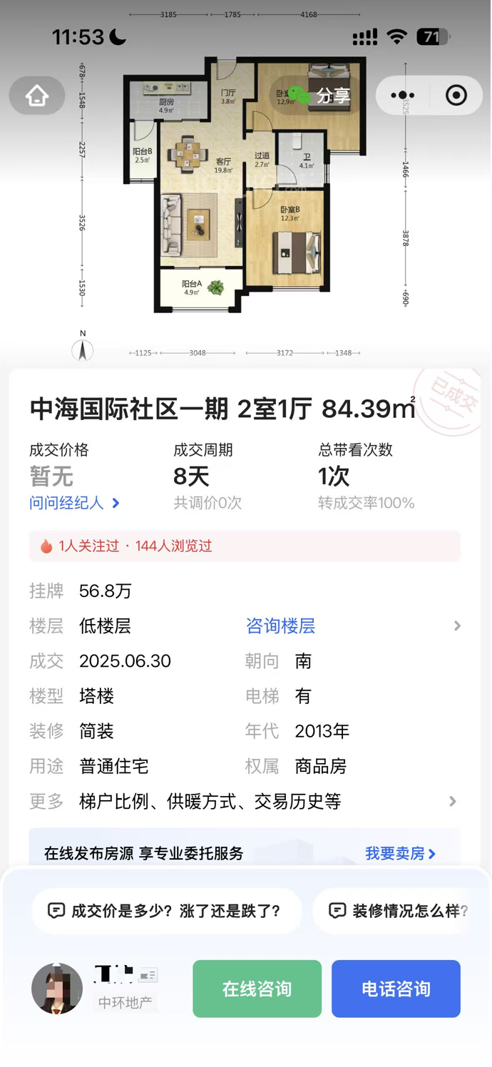 有缘分的房子来了,中海国际社区一期84平米,挂牌56.8万。