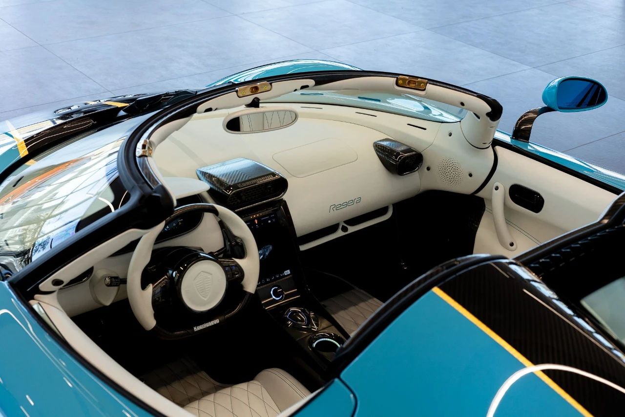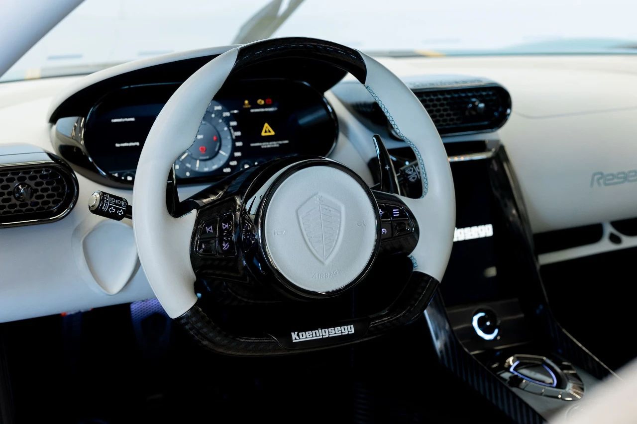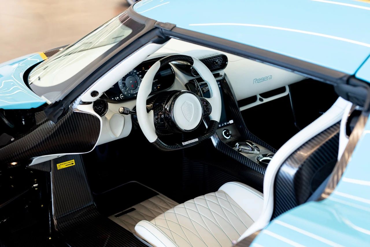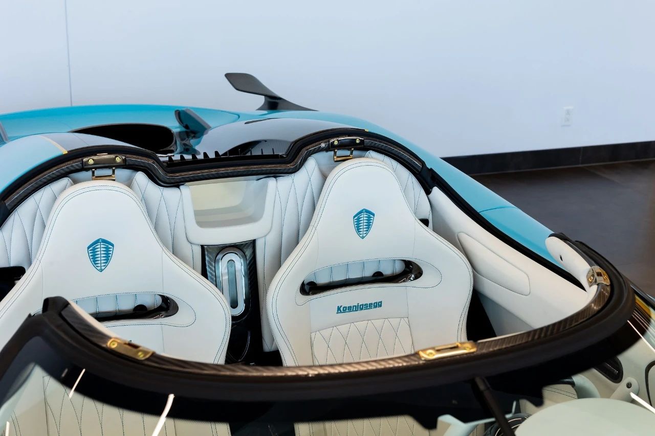 内饰方面,使用的是白色内饰,白色真皮座椅搭配具有鲜明对比感的浅蓝色缝线,极具运动属性。同时,Koenigsegg家族徽章与品牌标志出现在碳运动桶座椅上。