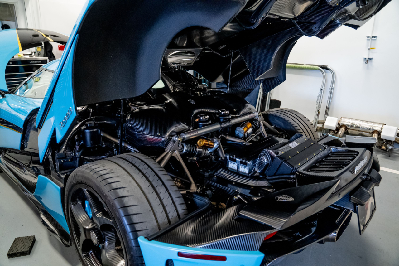 通过外观我们可以看到,该车选装了名为北欧之光的(蓝色)金属车漆,与极具光泽的裸露碳纤维装饰件搭配的同时,还在细节处加入了亮黄色点缀,看起来十分精致考究。
