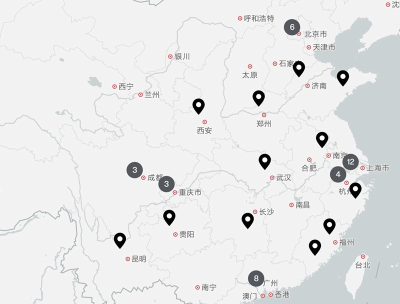 此外,北京有5个网点,广州、深圳、杭州各有4个,成都、重庆各有3个,苏州有2个。其他网点分布在无锡、南京、嘉兴、宁波、台州、天津、青岛、济南、郑州、西安、贵阳、长沙、昆明等城市。