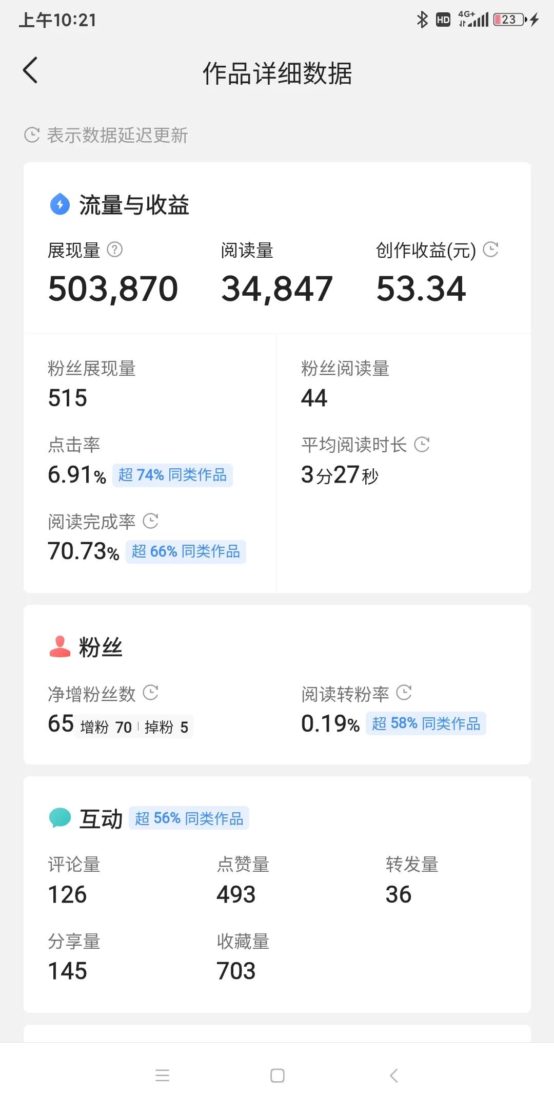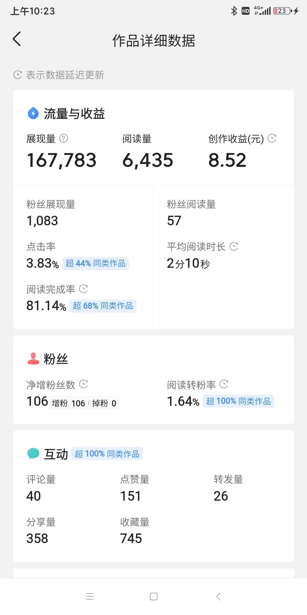 头条169天,关注786,收益百元,纪念一下,做个小总结: 【1】 往往一篇好点的发文就能double你的收益,比如我的帖图里8.52比当时累计收益多,53.34比当时累计收益多,但粉丝还是要逐渐积累,所以发文质量最重要 【2】 考虑头条受众群体,还是以日常生活的共鸣,热点为切入点写更容易些,考虑头条市场定位,应以知识增量,扩充认知边界为宜 【3】 玩头条心态不宜以赚钱为第一,搞好正业才有素材,不要纯为了头条而头条,花费大量时间,知识技能社会贡献值啥也没有就太没意思了 【4】 宣扬正能量,不要丧,这个社会的公序良俗不欢迎,也没必要,就做个棉花,此君一出天下暖 【5】 坚持不懈,不要三天打鱼两天晒网,影响力不是一日造就,不要刻意追求爆款,而是不断提升你存在的价值,有恒,诸事可成 写给自已,与君共勉,也谢谢关注我的各位,私下可多多交流[耶][耶][耶]